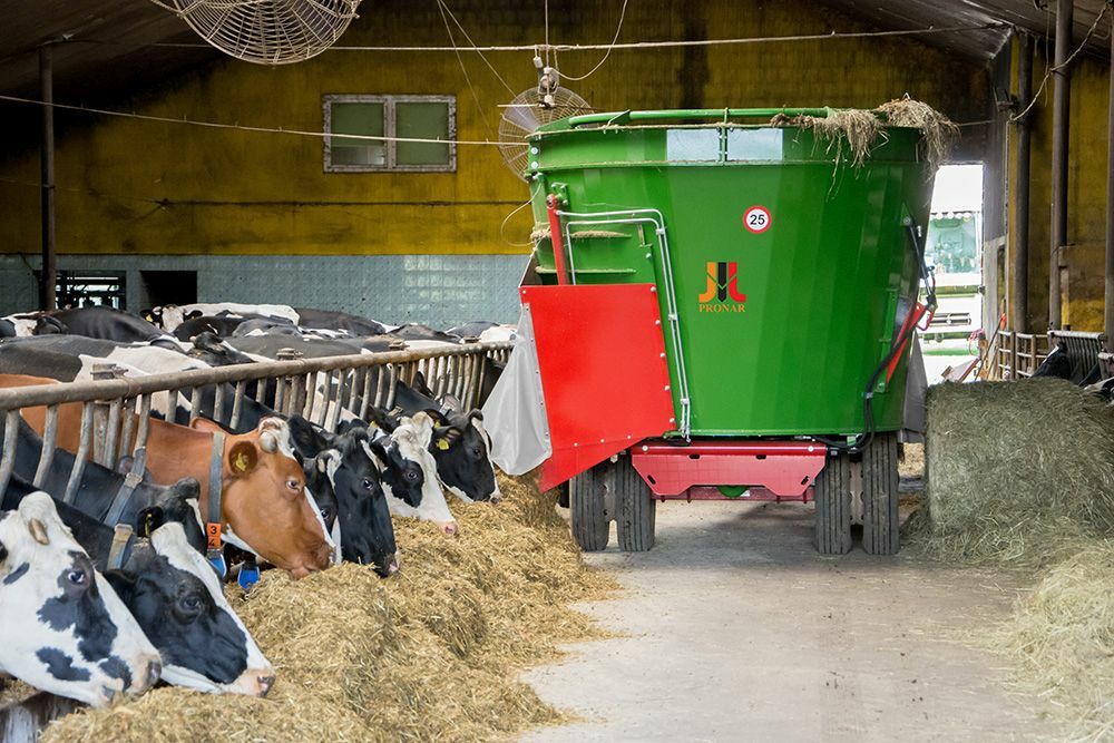 Кормораздатчик PRONAR DVMP – 12/14/16/18 - Задача данного кормораздатчика является дробление и подача корма в форме так называемого TMR – полностью смешанной дозы. Принятие полноценной и питательной дозы ограничивает риск заболеваний пищеварительной системы, что непосредственно влияет на удой молока.Серия DVMP включает в себя следующие модели: DVMP-12, DVMP-14, DVMP-16 и DVMP-18, вместимостью 12, 14, 16 и 18 м3 соответственно. Такие объемы вынудили применение двух перемешивающих шнеков в инновационной конструкции. Конструкция двух перемешивающих шнеков, толщиной 15 мм, обеспечивает правильное смешивание по объему и полноценности кормов.Высокое качество производства обеспечивает долголетнюю эксплуатацию и надежную работу, а богатое оснащение и элементы дополнительного оборудования, позволяет приспособить машины для каждого хозяйства.